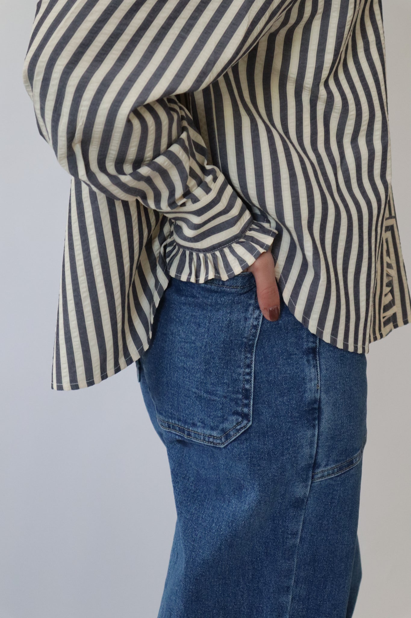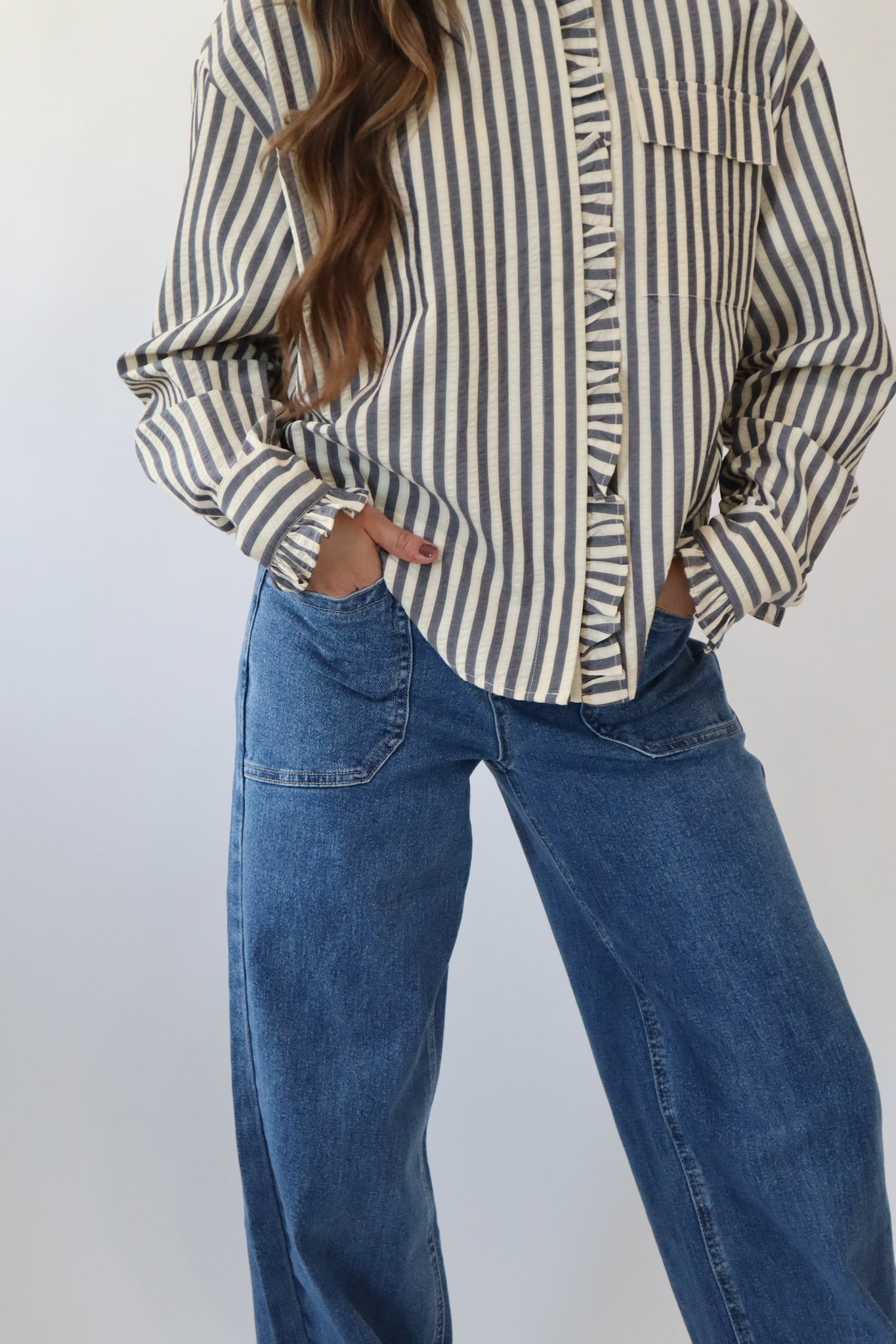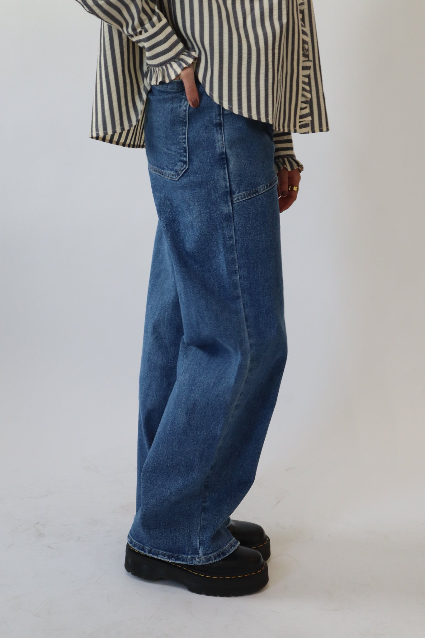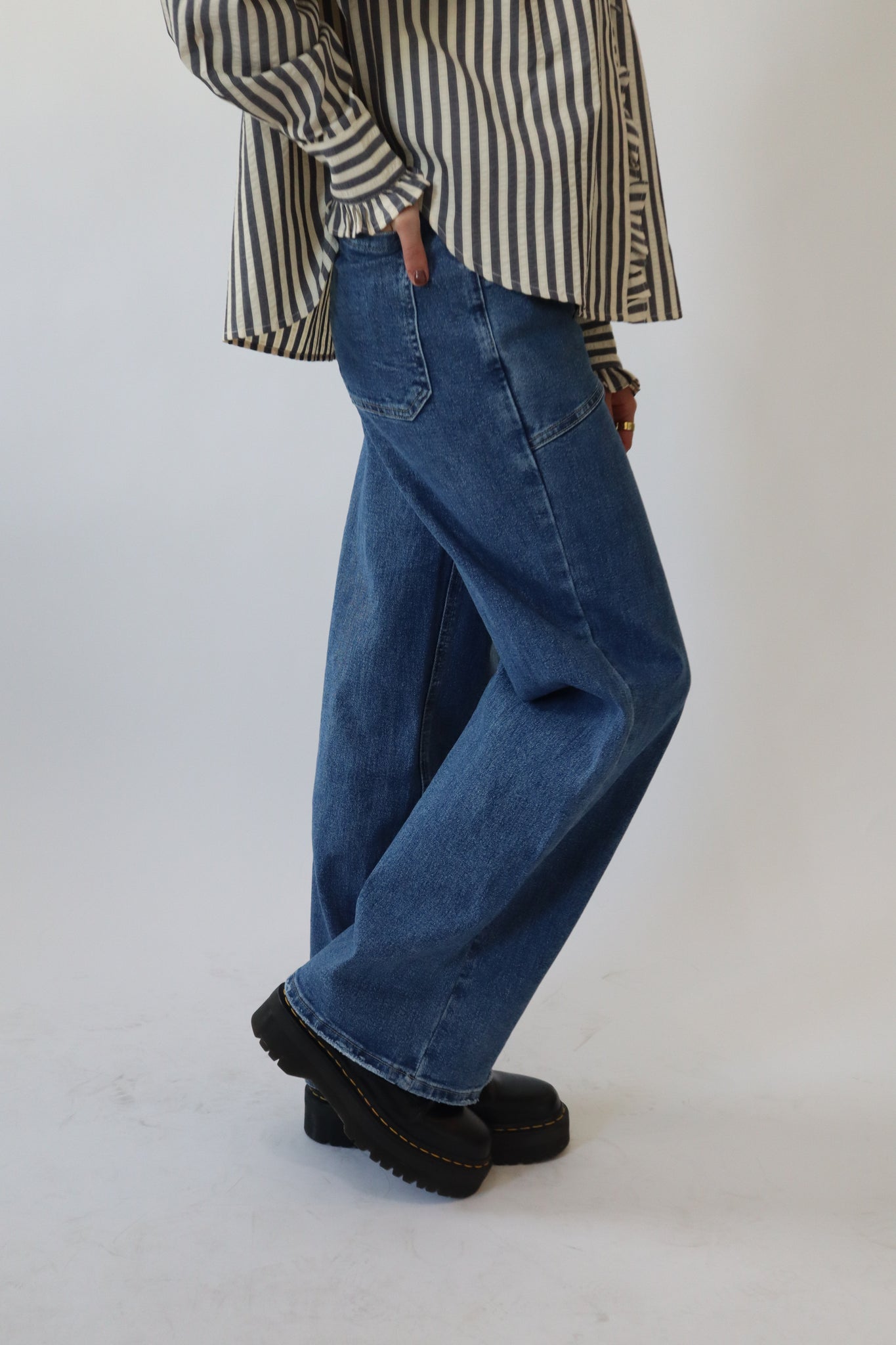 Denim High Rise Seamed Pockets Straight Leg Jeans