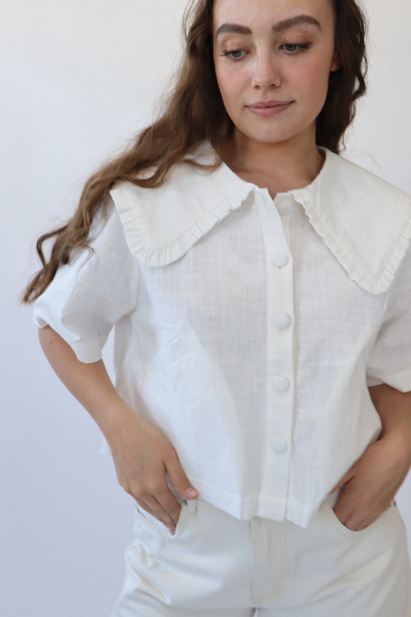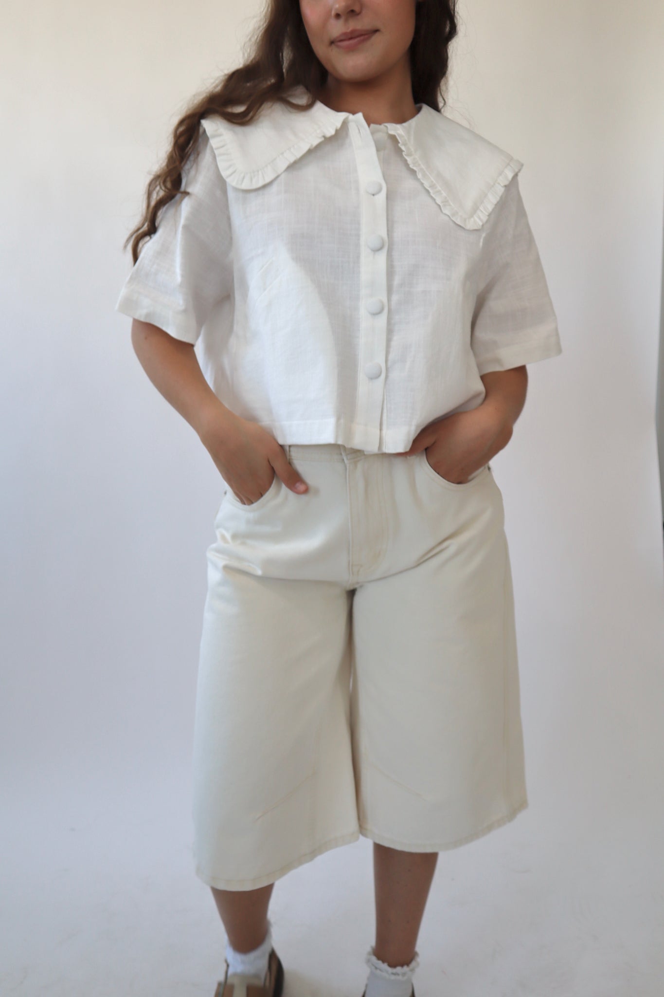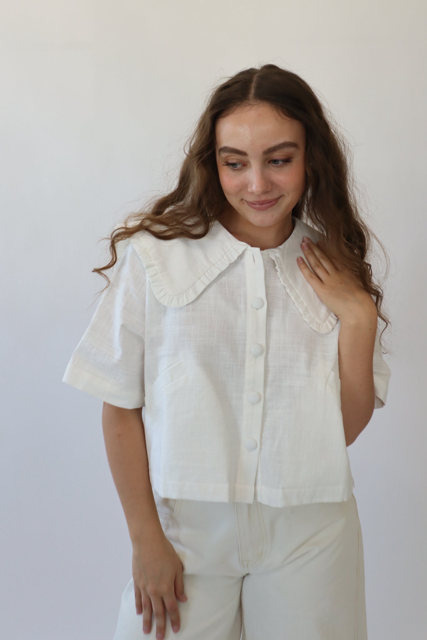 White linen collared short sleeve button down top.