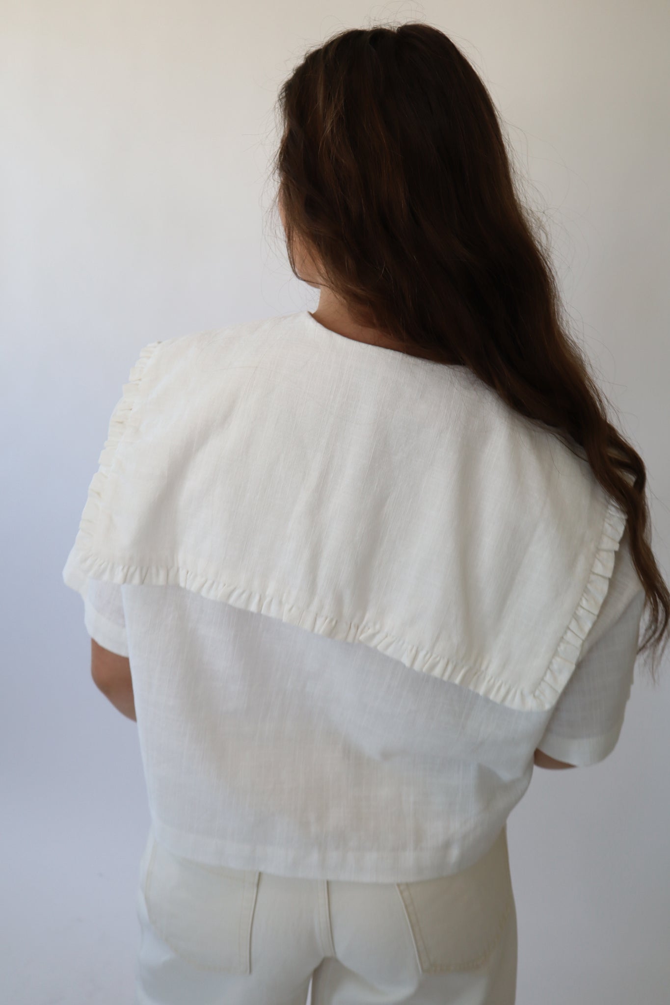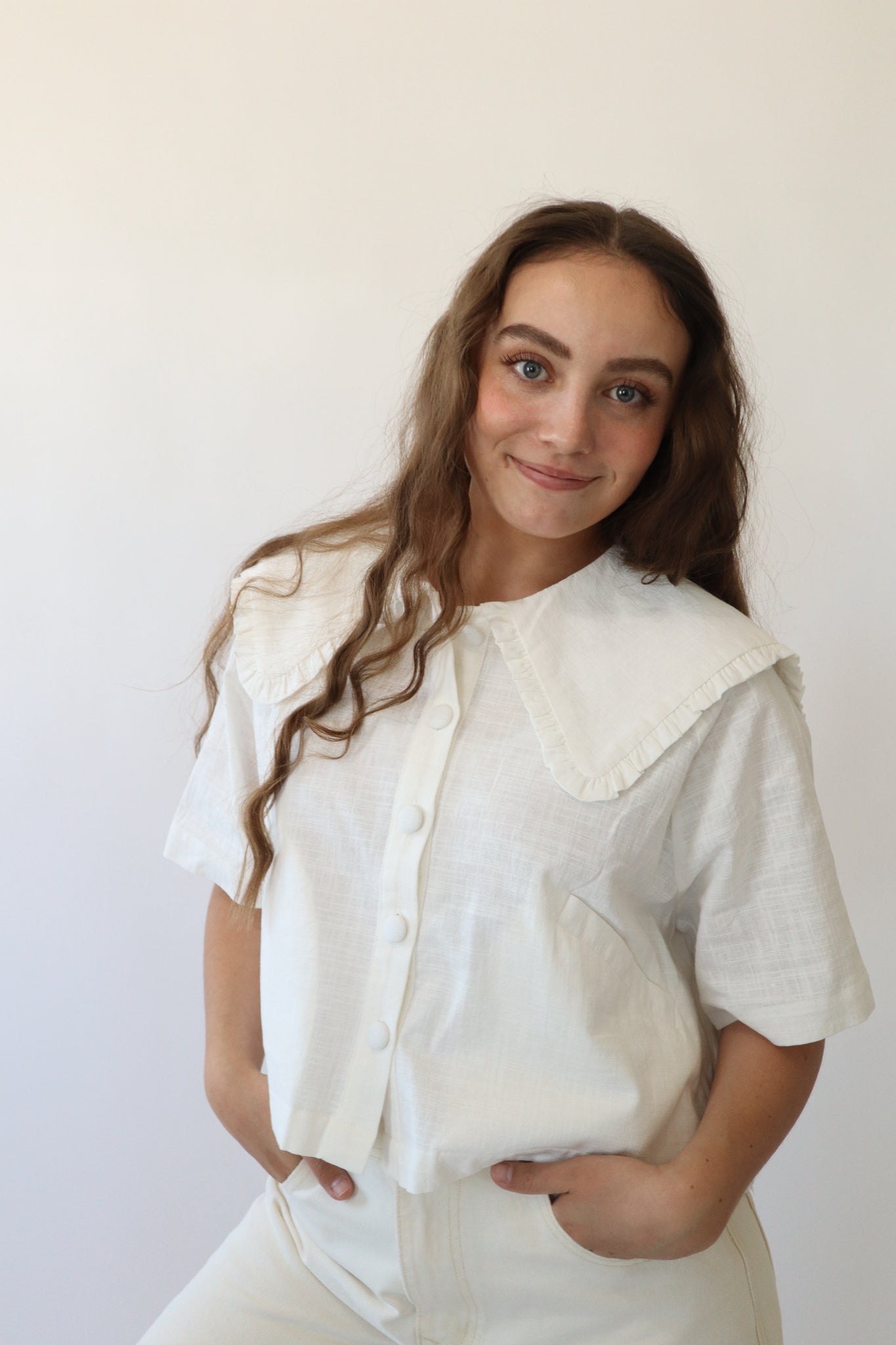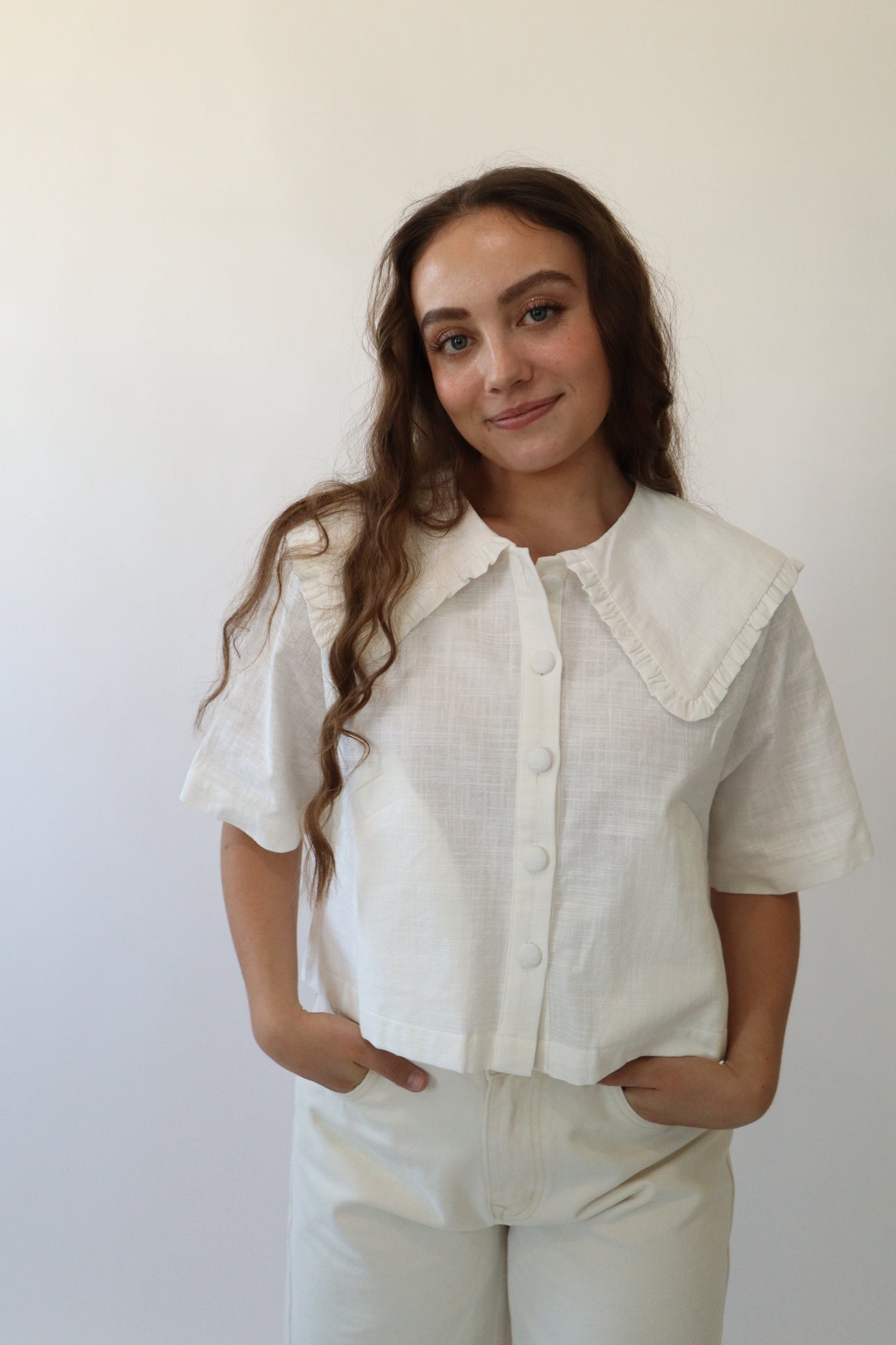 White linen collared short sleeve button down top.