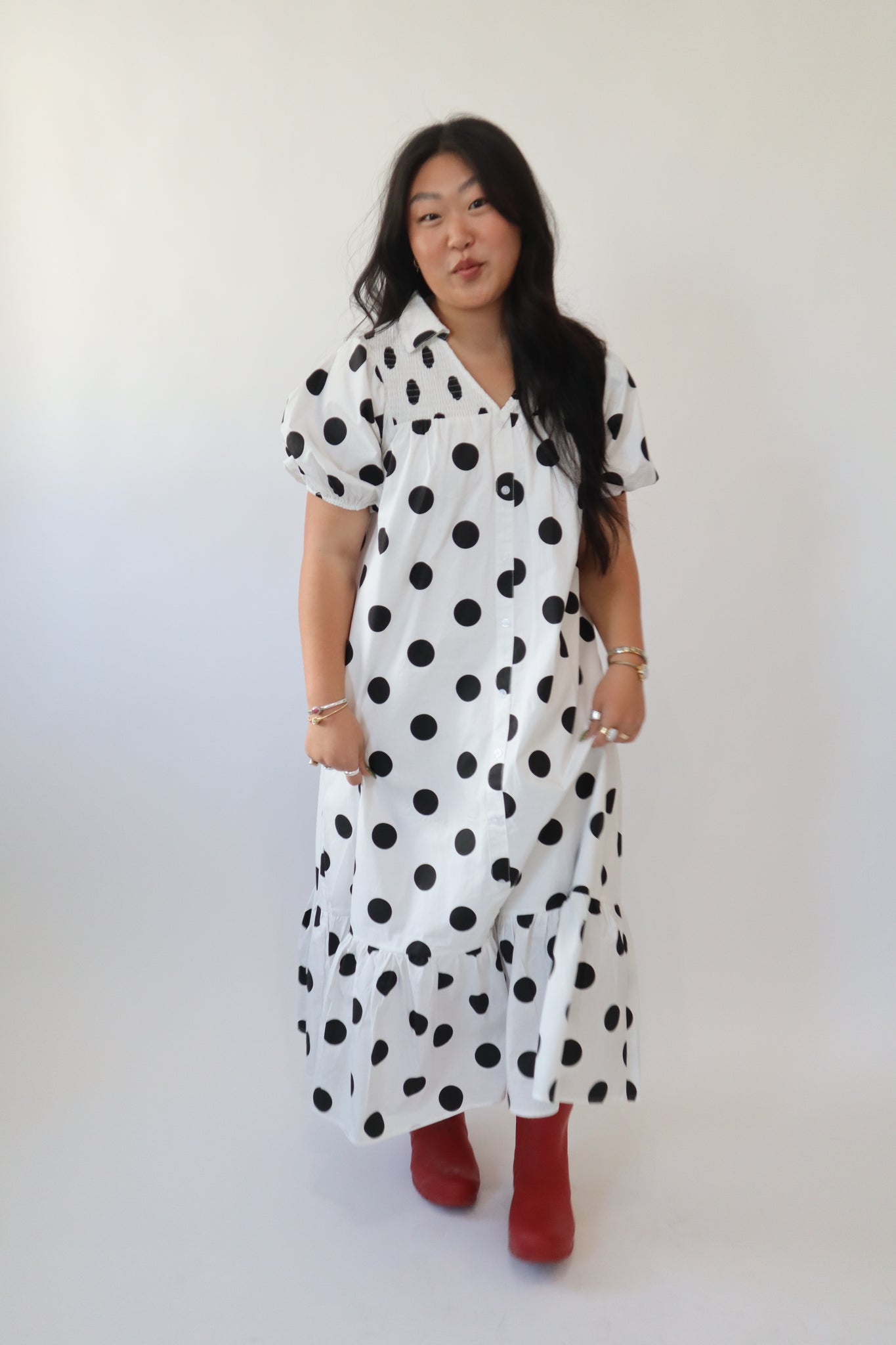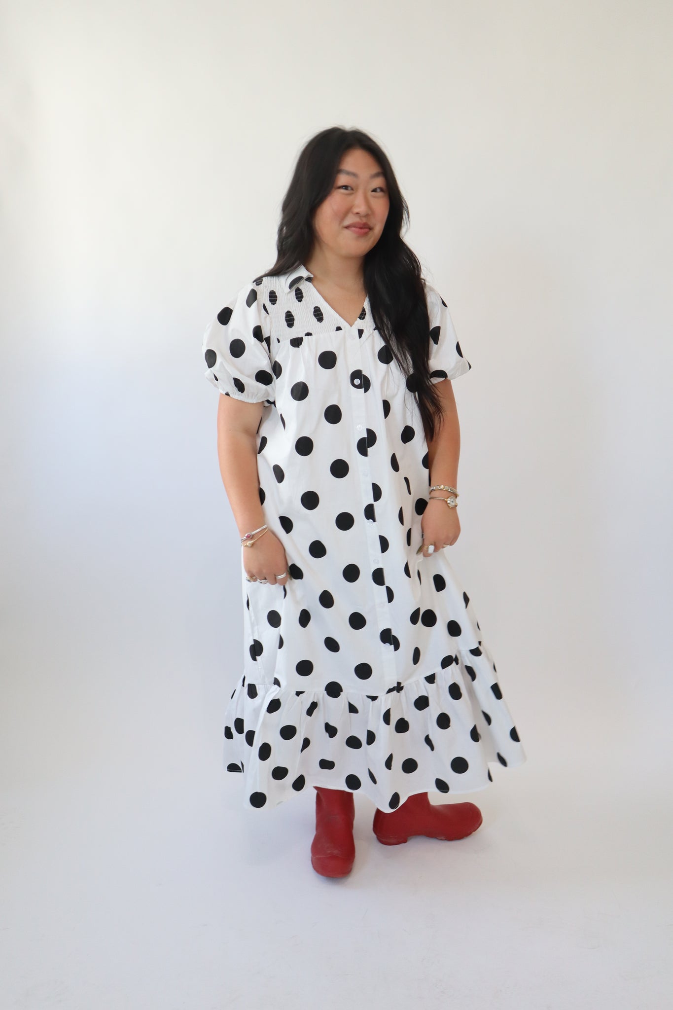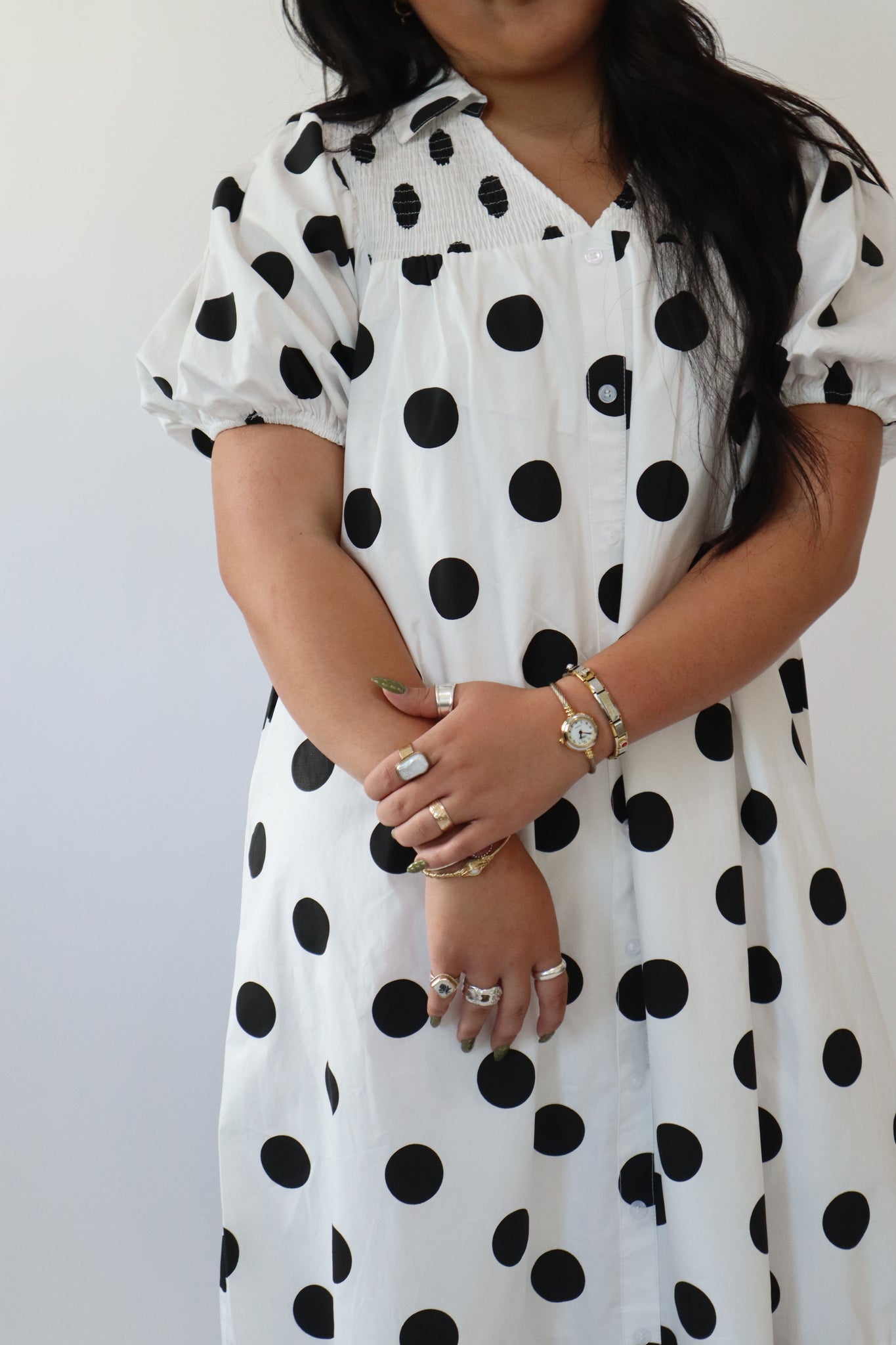 White and Black Polka Dot Button Down Midi Shirt Dress W/ Puff Sleeve