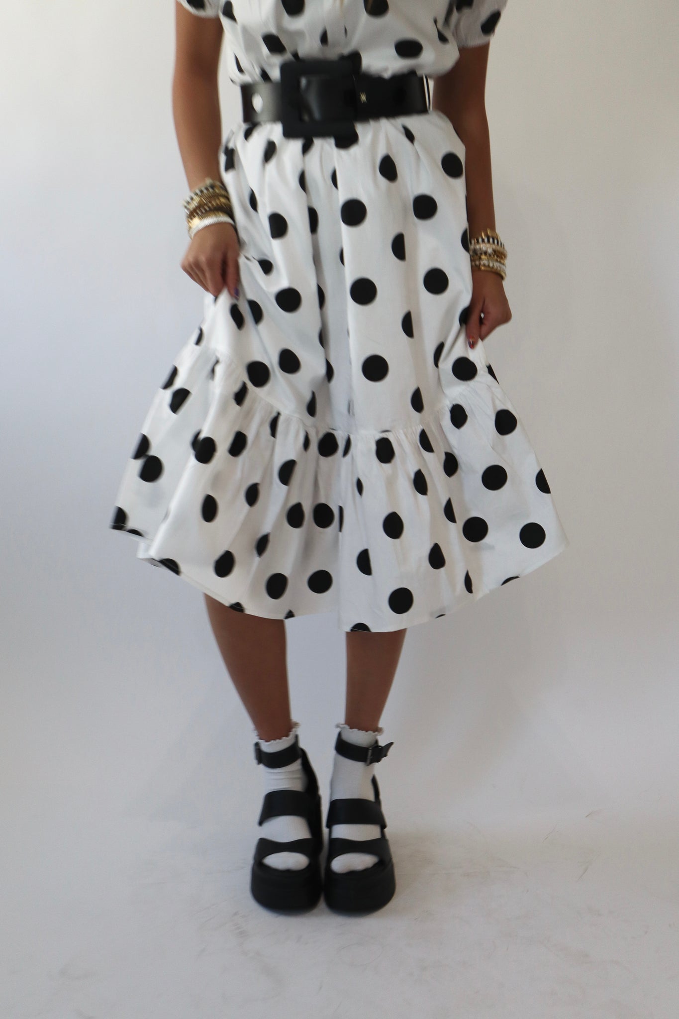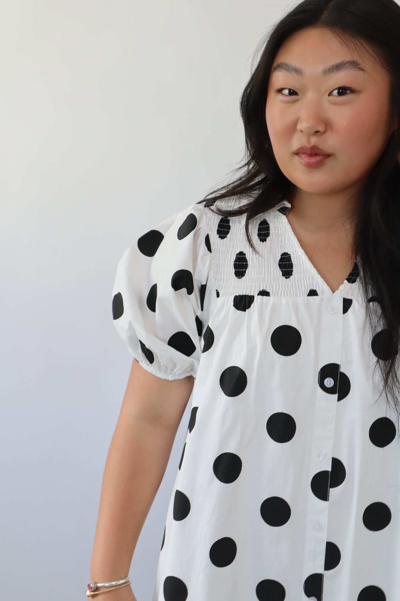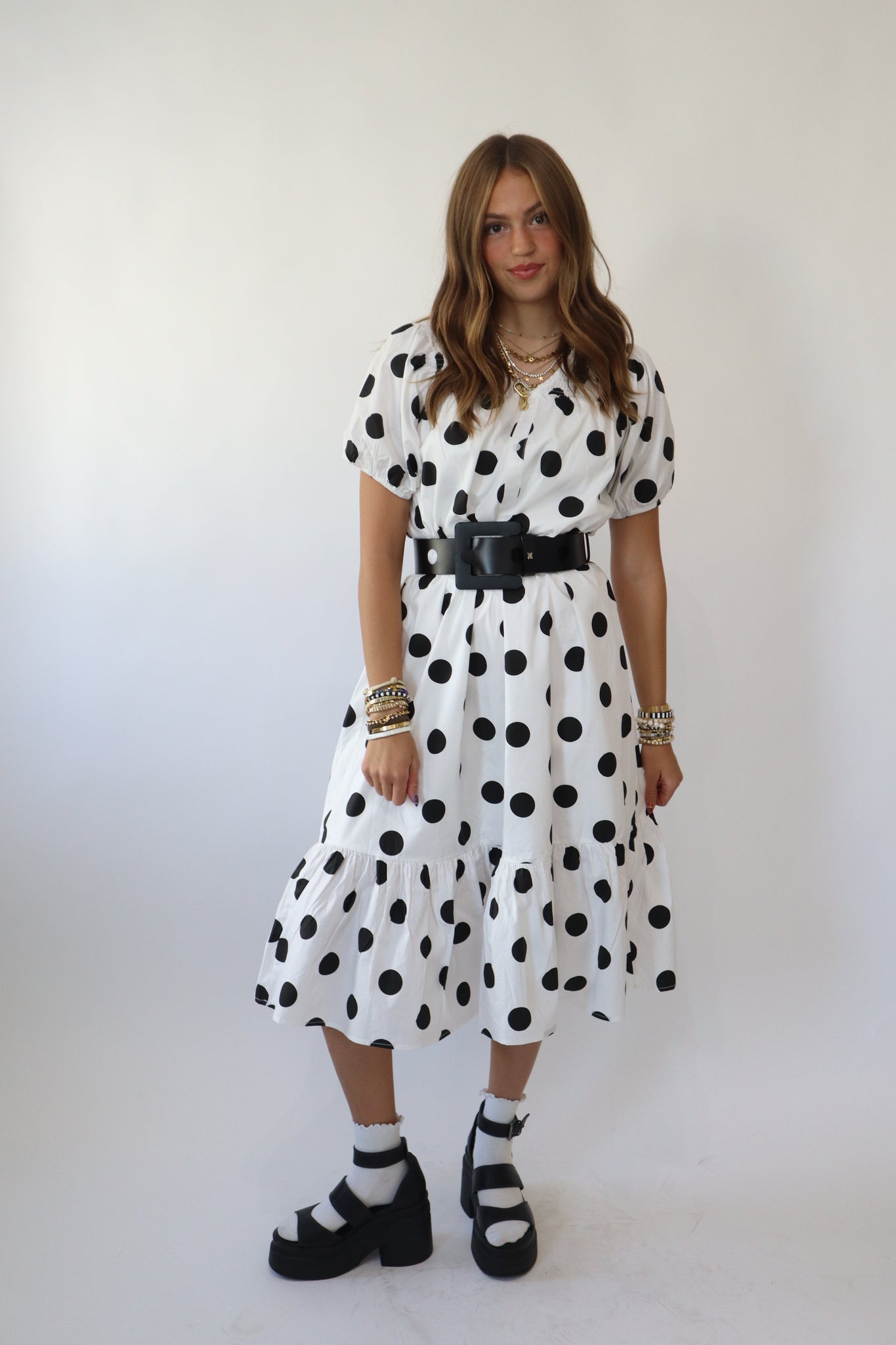 White and Black Polka Dot Button Down Midi Shirt Dress W/ Puff Sleeve