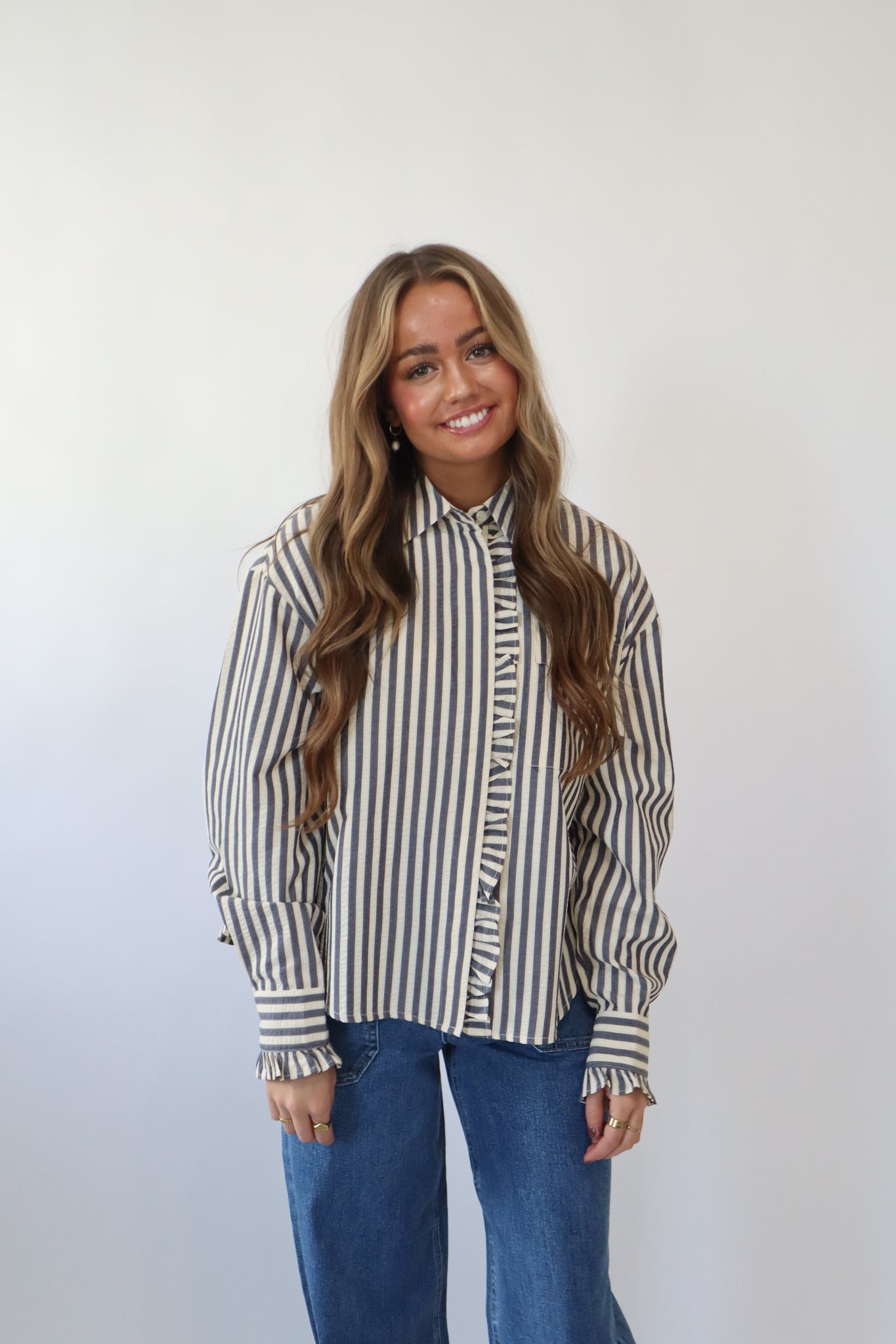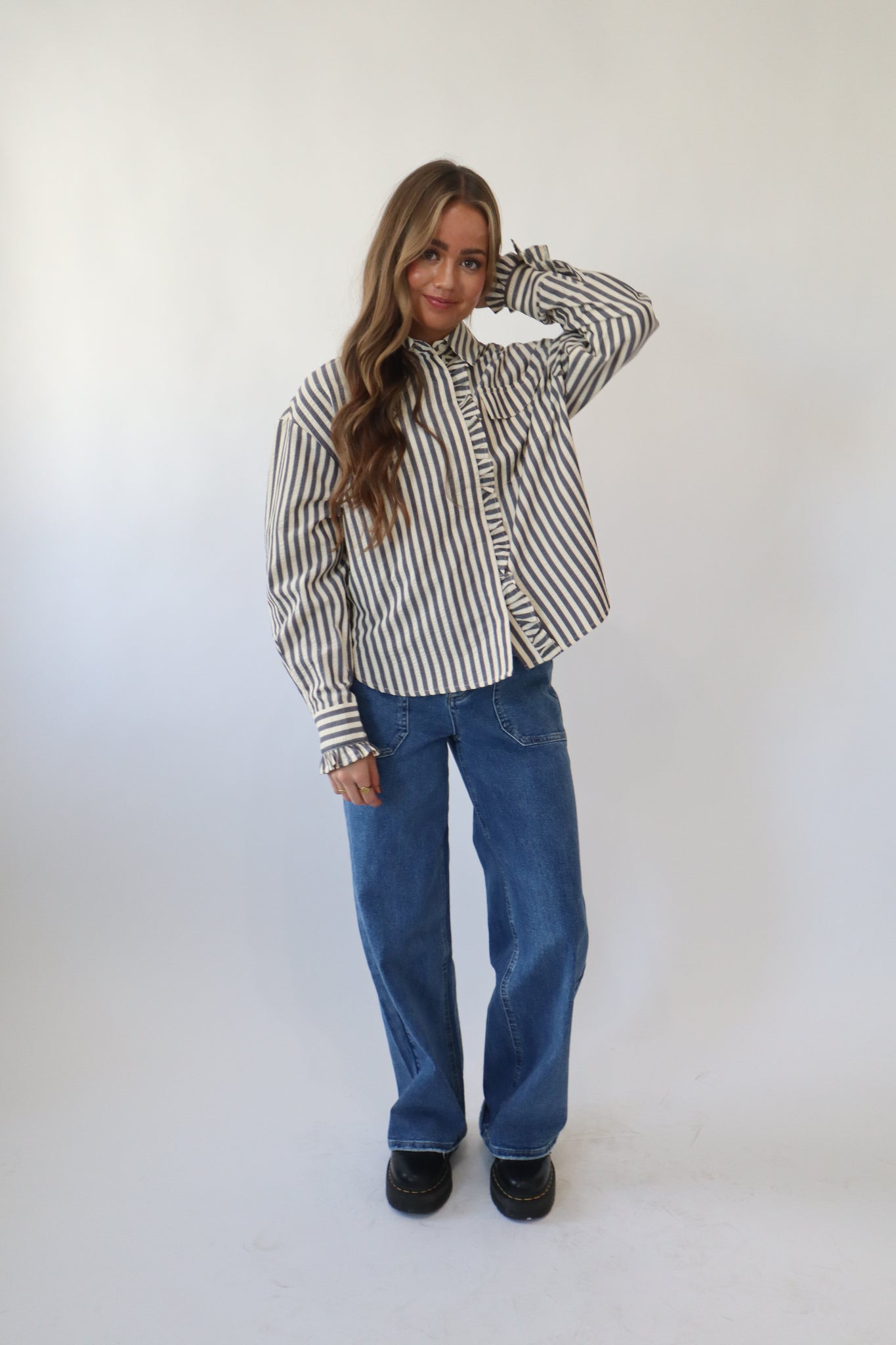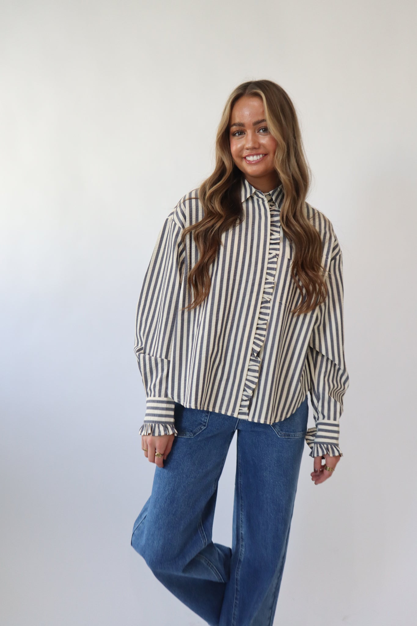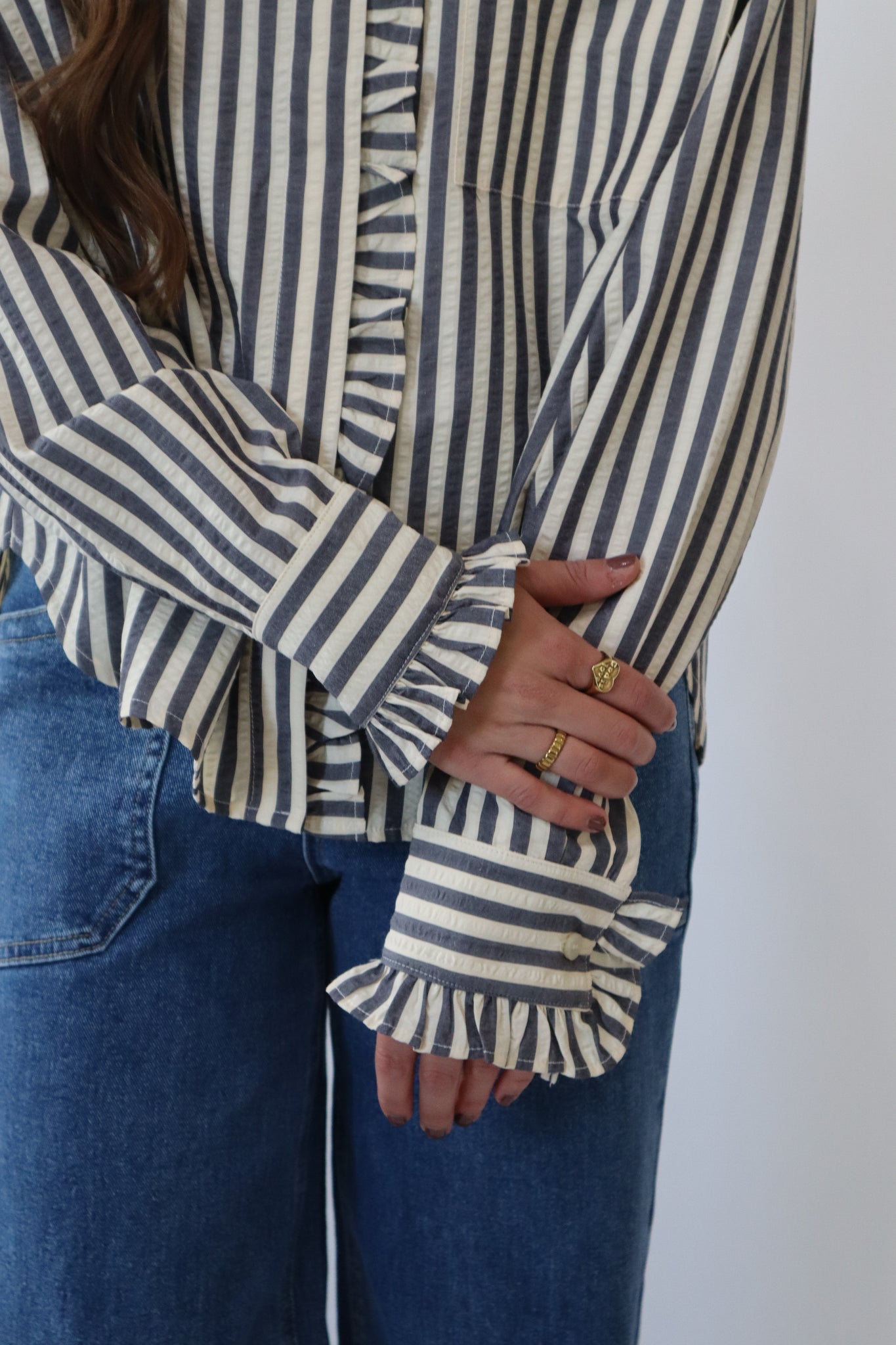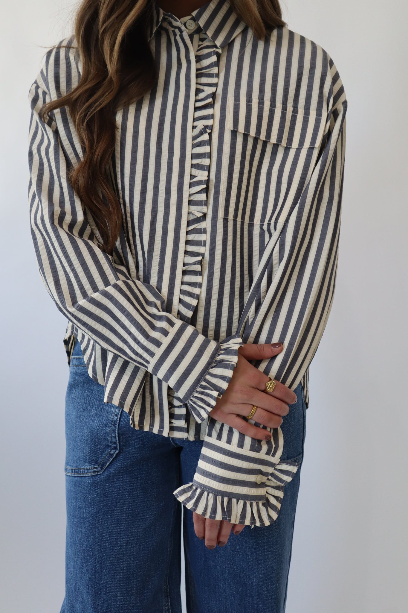 Deep Navy Striped Vintage Ruffled Hide Button Down Long Sleeve
