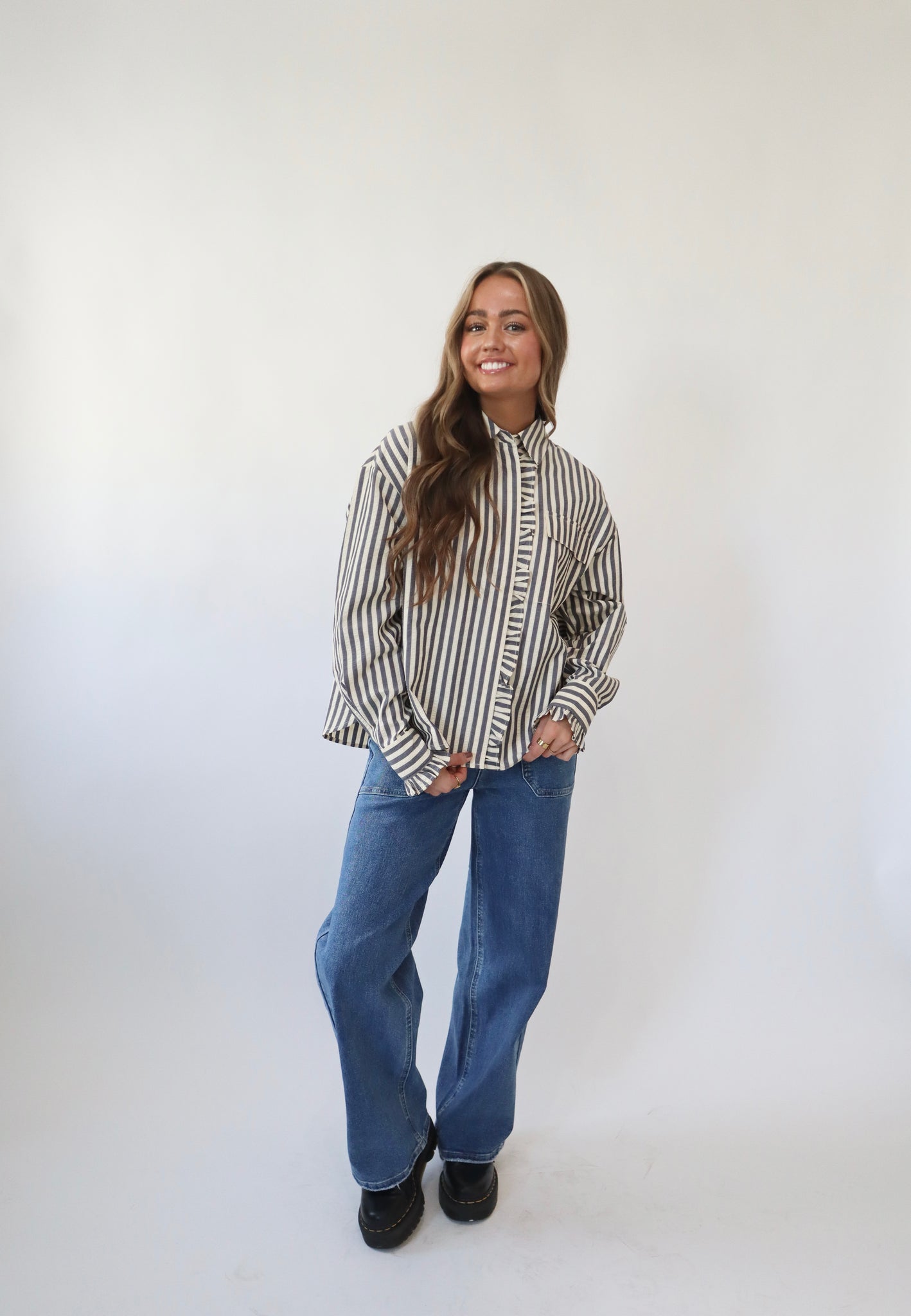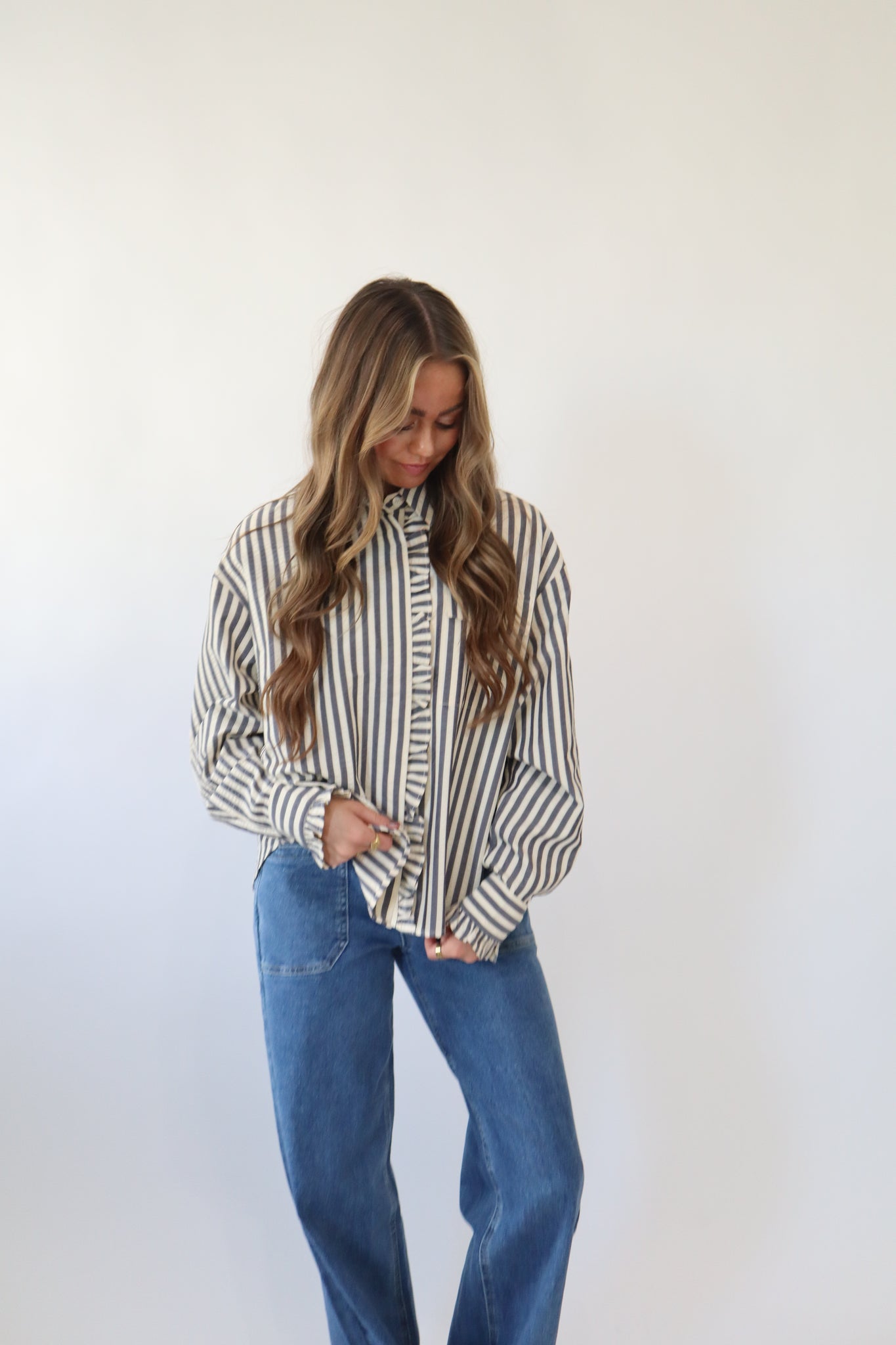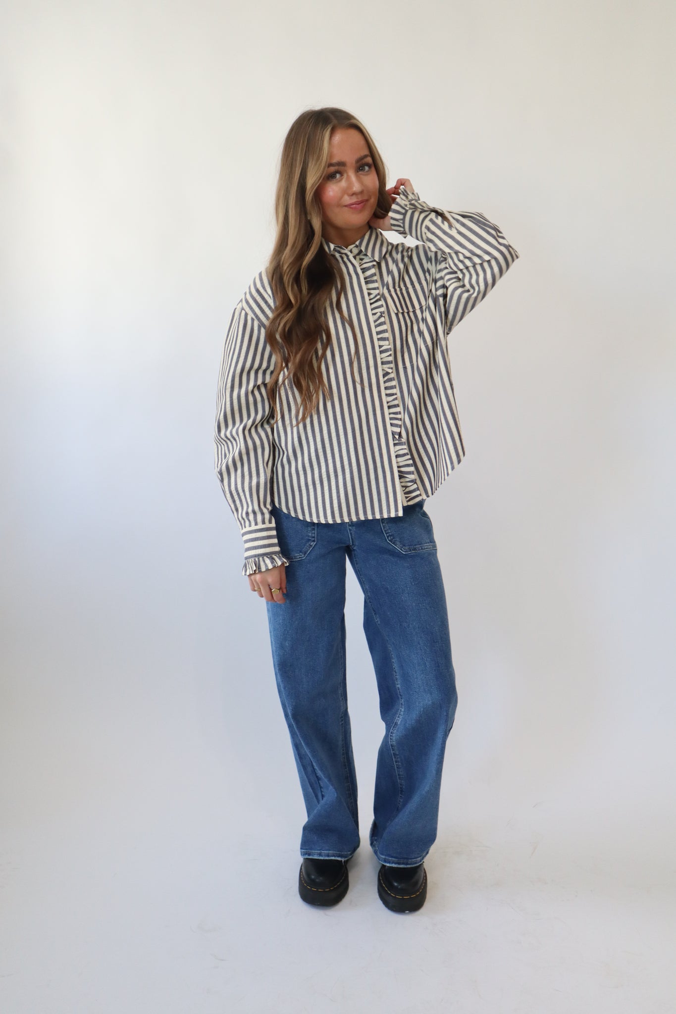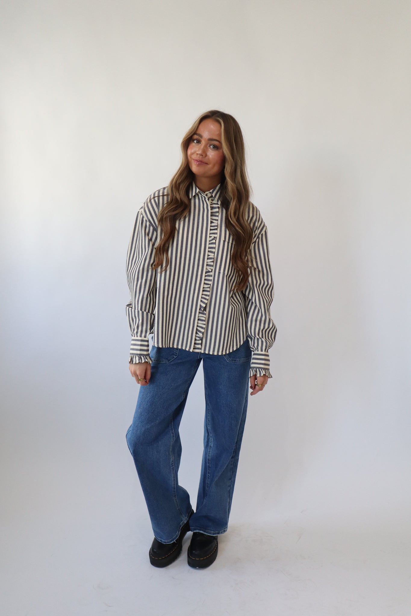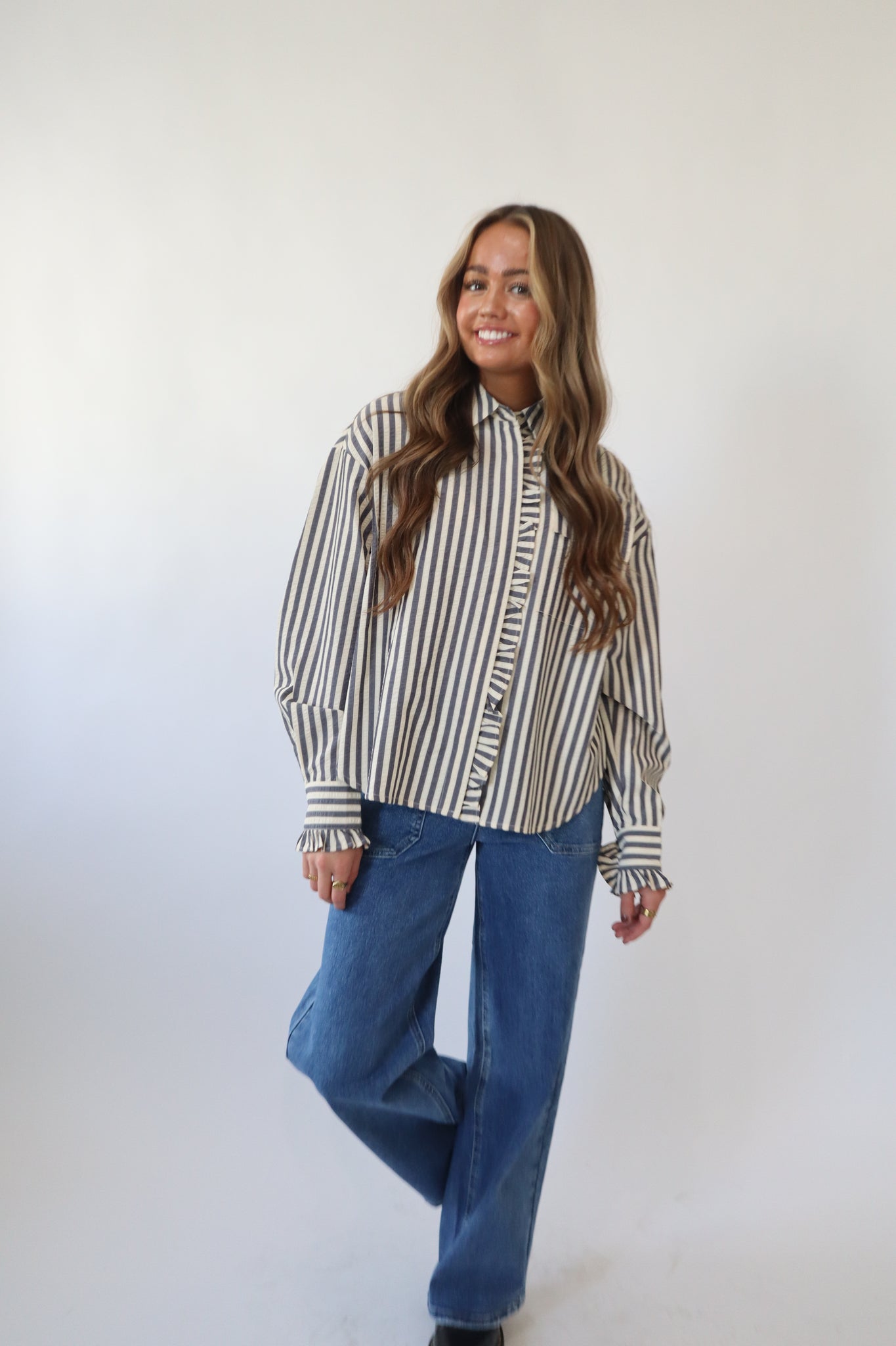 Deep Navy Striped Vintage Ruffled Hide Button Down Long Sleeve