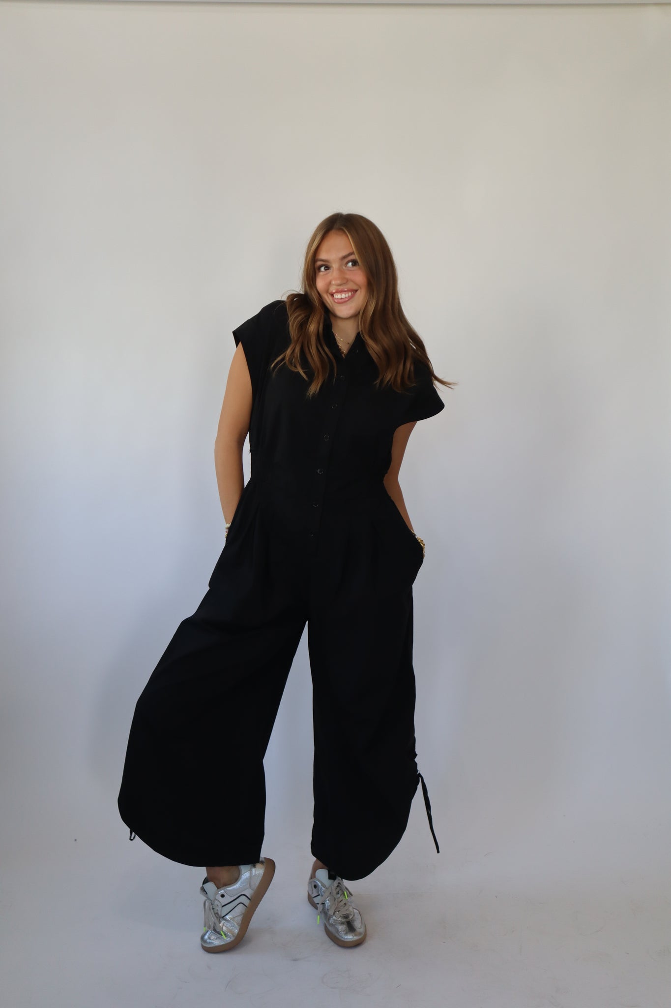 Black Button Down Utility Shirting Jumpsuit W/ Leg Ties