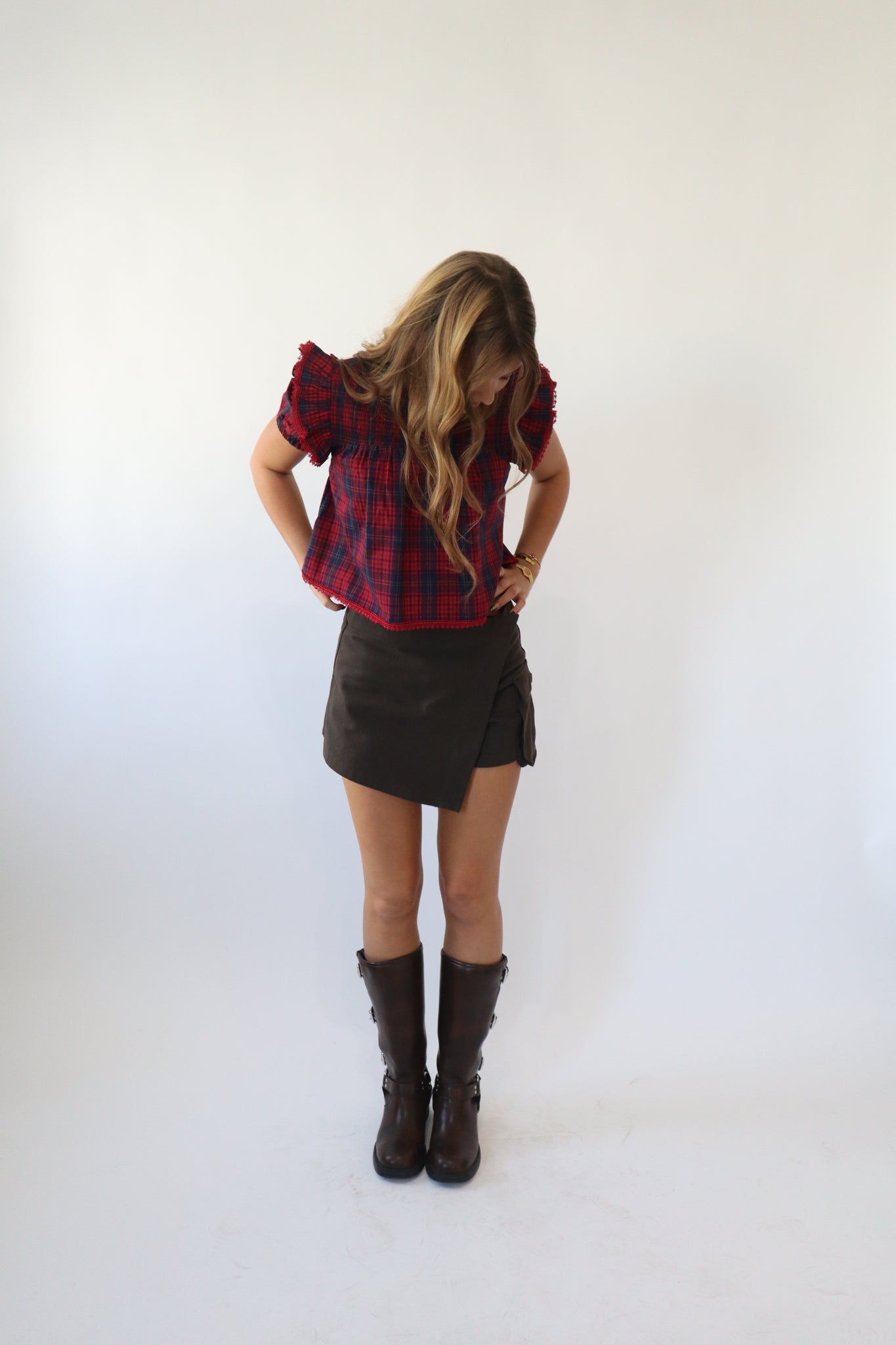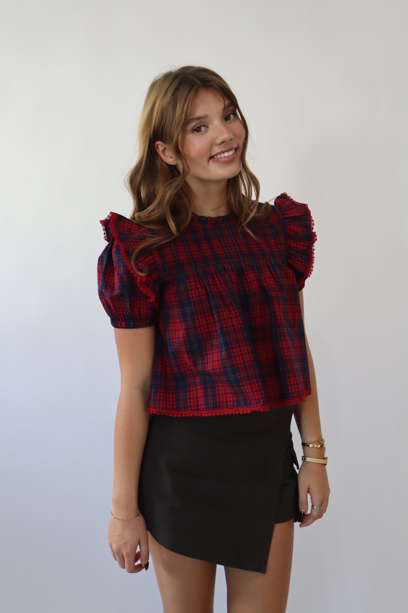 Plaid Puff Sleeve With Smocking and Lace Trim Detail