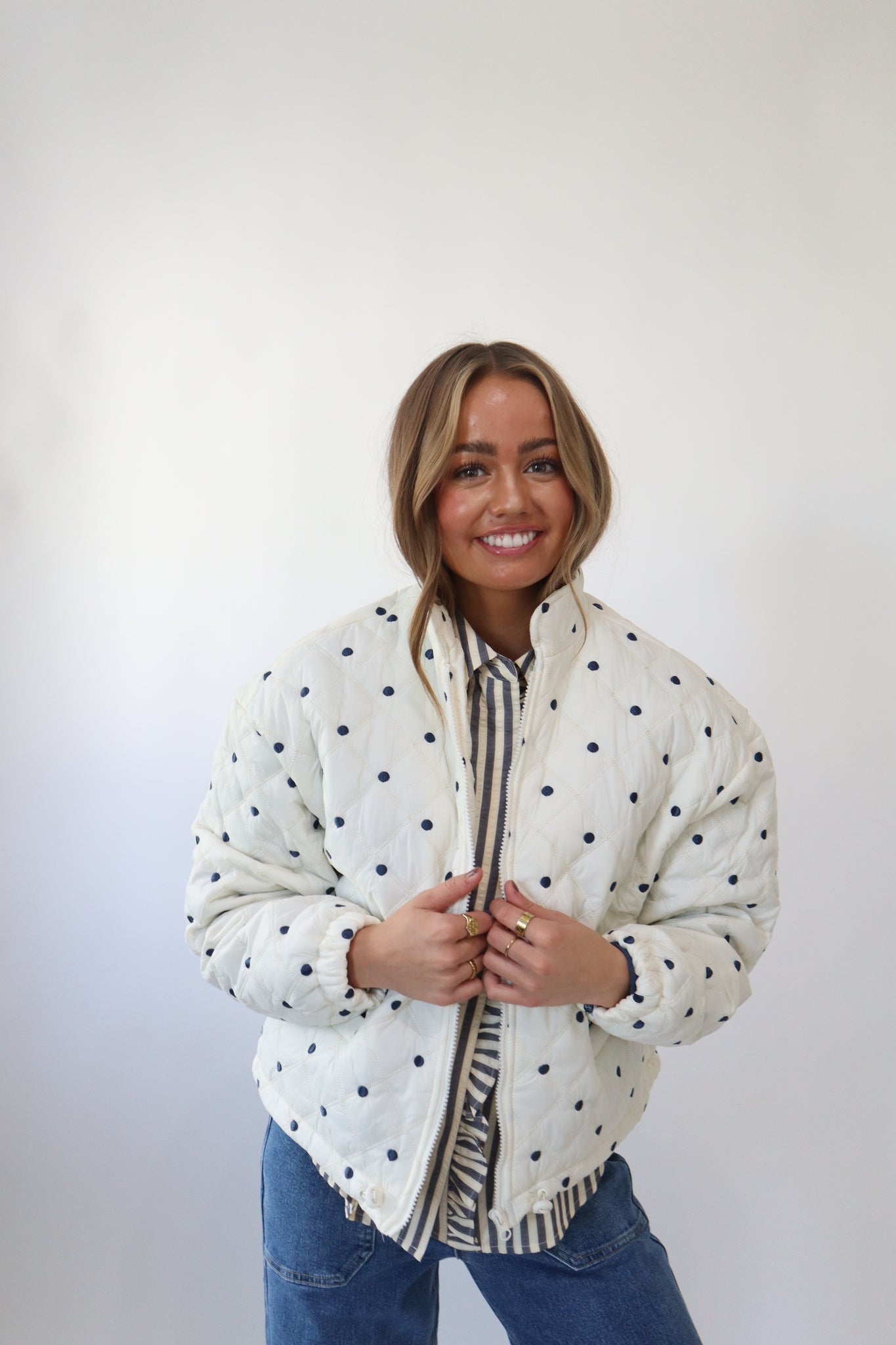 Cream Quilted Puffer Jacket W/ Navy Embroidered Polka Dots