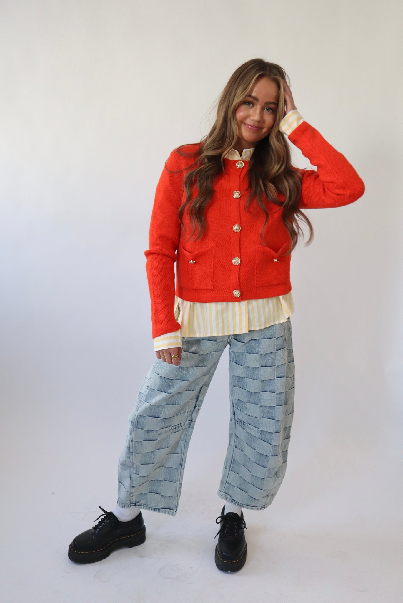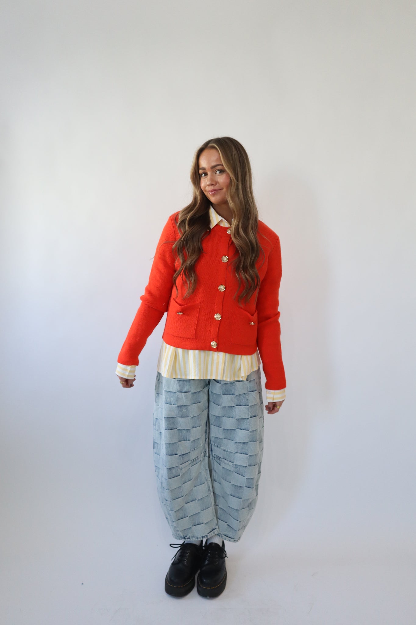 Red knit cardigan with front pockets and gold buttons.